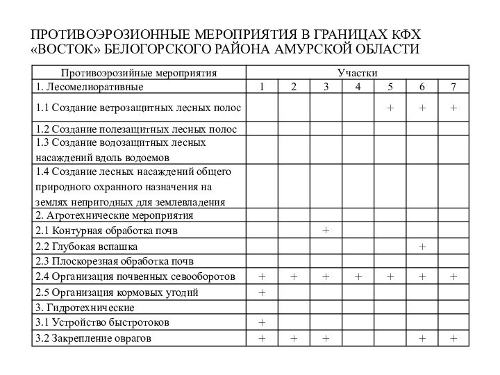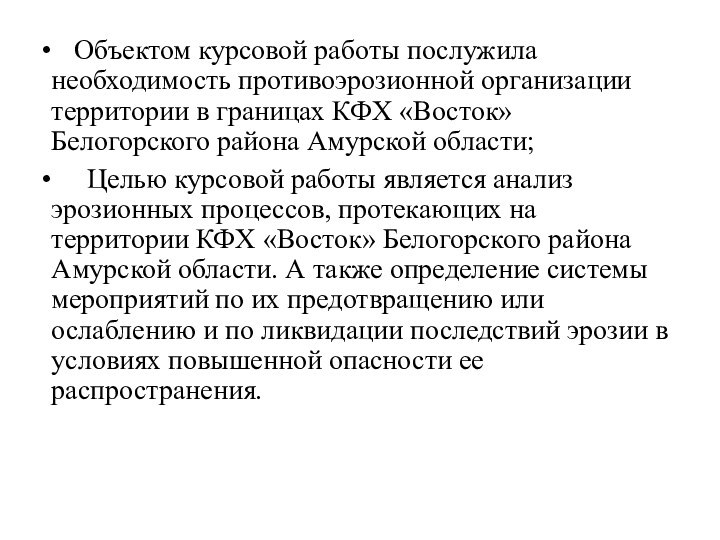 Объектом курсовой работы послужила необходимость противоэрозионной организации территории в границах КФХ «Восток» Белогорского района Амурской области; Целью курсовой работы является анализ эрозионных процессов, протекающих на территории КФХ «Восток» Белогорского района Амурской области. А также