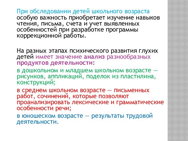 На разных этапах психического развития глухих детей имеет значение анализ разнообразных продуктов деятельности: