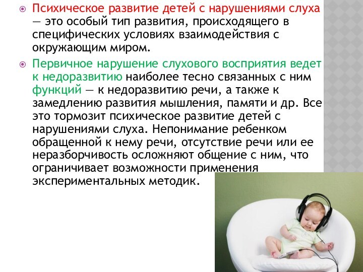 Первичное нарушение слухового восприятия ведет к недоразвитию наиболее тесно связанных с ним функций — к недоразвитию речи, а также к замедлению развития мышления, памяти и др. Все это тормозит психическое развитие детей с нарушениями слуха. Непонимание ребенком обращенной к нему речи, отсутствие речи или ее неразборчивость осложняют общение с ним, что ограничивает возможности применения экспериментальных методик.