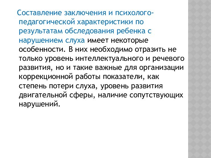 них необходимо отразить не только уровень интеллектуального и речевого развития, но и такие важные для организации коррекционной работы показатели, как степень потери слуха, уровень развития двигательной сферы, наличие сопутствующих нарушений.