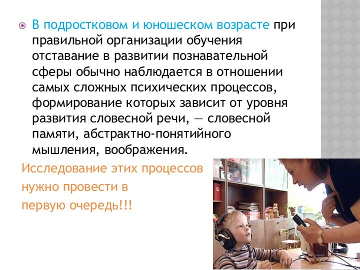 отношении самых сложных психических процессов, формирование которых зависит от уровня развития словесной речи, — словесной памяти, абстрактно-понятийного мышления, воображения.