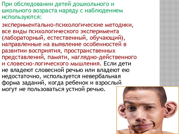 естественный, обучающий), направленные на выявление особенностей в развитии восприятия, пространственных представлений, памяти, наглядно-действенного и словесно-логического мышления. Если дети не владеют словесной речью или владеют ею недостаточно, используется невербальная форма заданий, когда ребенок и взрослый могут не пользоваться устной речью.