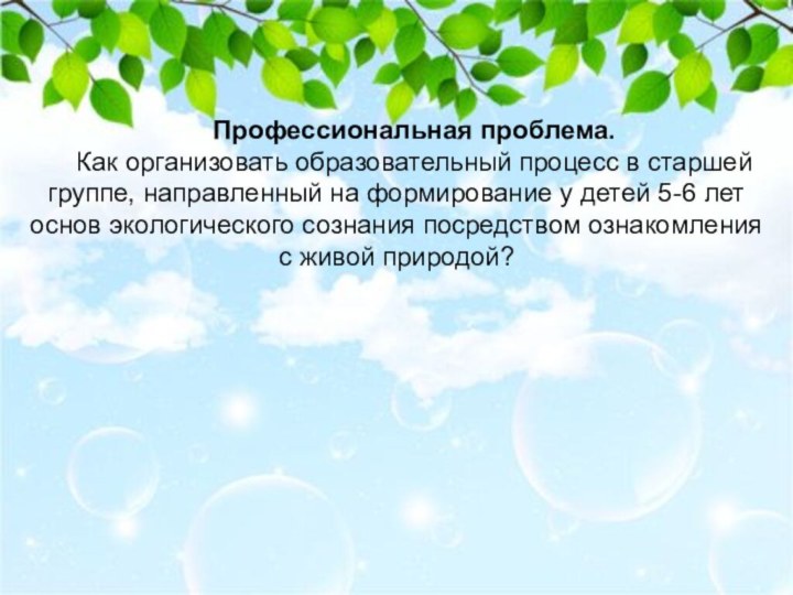 В формировании основ экологического сознания большую роль играет ознакомление детей с живой природой. Именно ознакомление с живой природой позволяет подвести к пониманию того, что жизнь человека на Земле во многом зависит от окружающей среды: чистый воздух, вода, лес, растения благоприятно сказывается на здоровье и жизни человека.