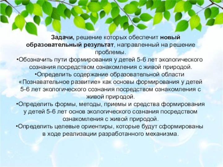 Определить содержание образовательной области «Познавательное развитие» как основы формирования у детей 5-6 лет экологического сознания посредством ознакомления с живой природой.