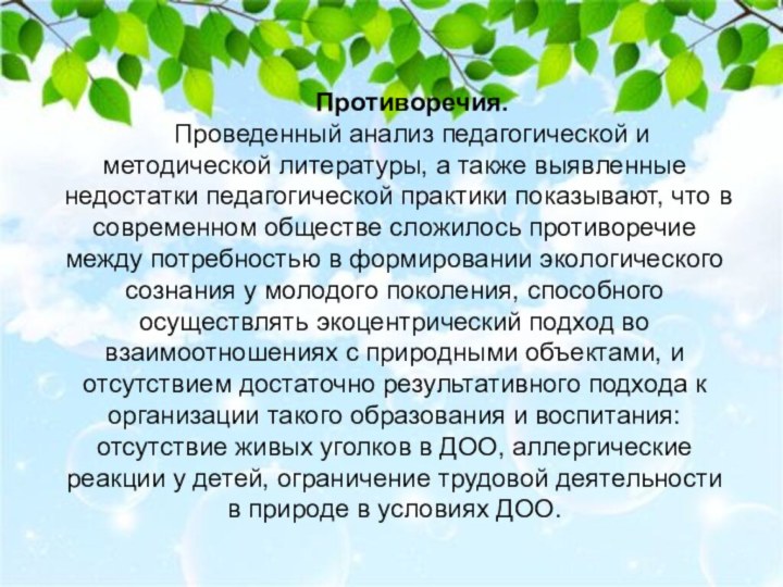 сложилось противоречие между потребностью в формировании экологического сознания у молодого поколения, способного осуществлять экоцентрический подход во взаимоотношениях с природными объектами, и отсутствием достаточно результативного подхода к организации такого образования и воспитания: отсутствие живых уголков в ДОО, аллергические реакции у детей, ограничение трудовой деятельности в природе в условиях ДОО.
