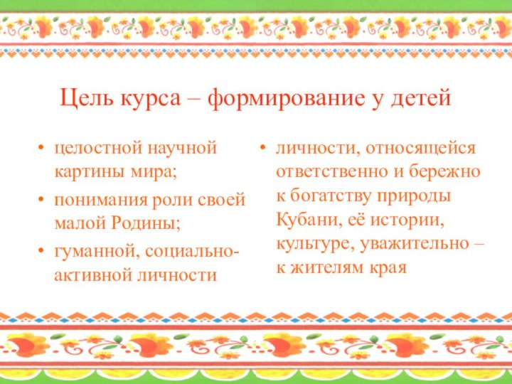 Цель курса – формирование у детейцелостной научной картины мира;понимания роли своей