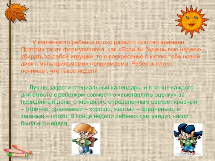 «Если ты будешь всю неделю убирать за собой игрушки, то в воскресенье я куплю тебе новый диск с мультфильмами» неприемлема. Ребенок плохо понимает, что такое неделя.