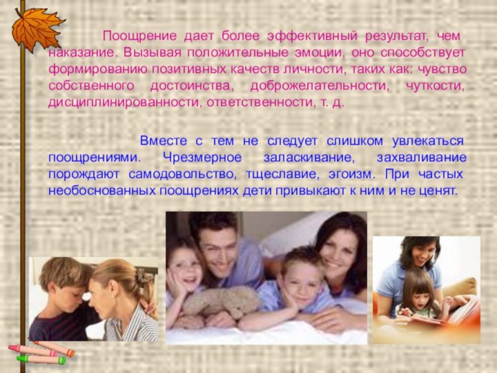 Вместе с тем не следует слишком увлекаться поощрениями. Чрезмерное заласкивание, захваливание порождают самодовольство, тщеславие, эгоизм. При частых необоснованных поощрениях дети привыкают к ним и не ценят.