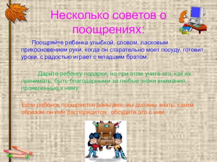Если ребёнок поощряется деньгами, вы должны знать, каким образом он ими распорядится, обсудите это с ним.