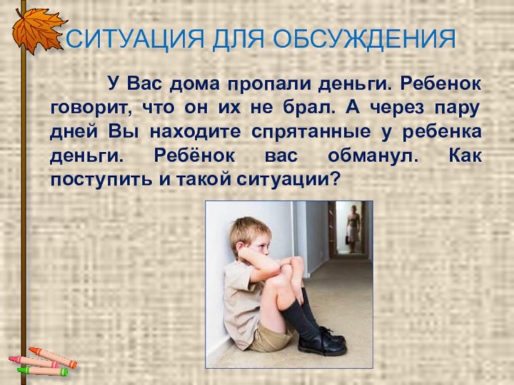 он их не брал. А через пару дней Вы находите спрятанные у ребенка деньги. Ребёнок вас обманул. Как поступить и такой ситуации?