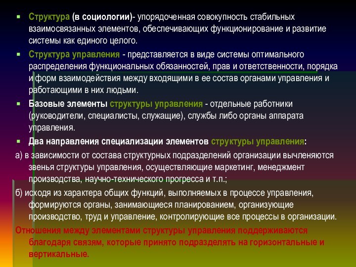 а) в зависимости от состава структурных подразделений организации вычленяются звенья структуры управления, осуществляющие маркетинг, менеджмент производства, научно-технического прогресса и т.п.;