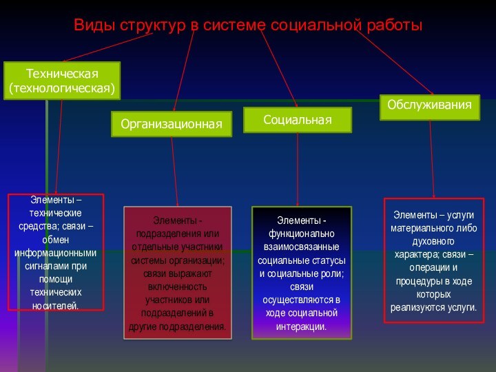 Элементы -функционально взаимосвязанные социальные статусы и социальные роли; связи осуществляются в ходе социальной интеракции.