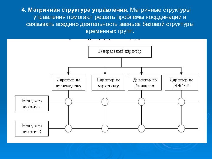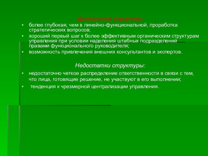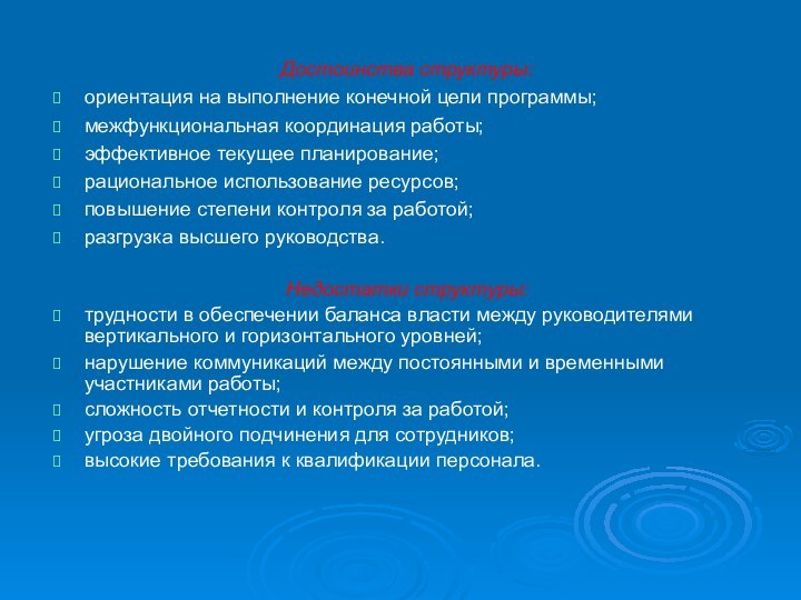 Невозможность централизации управления, путаница во взаимоотношениях внутри организации и с внешним окружением, постоянно возникающая напряженность и возникновение конфликтных ситуаций. Однако в случае тщательной научной разработки такой структуры она может стать буквально незаменимой для организаций, работающих в сложных и постоянно изменяющихся условиях.