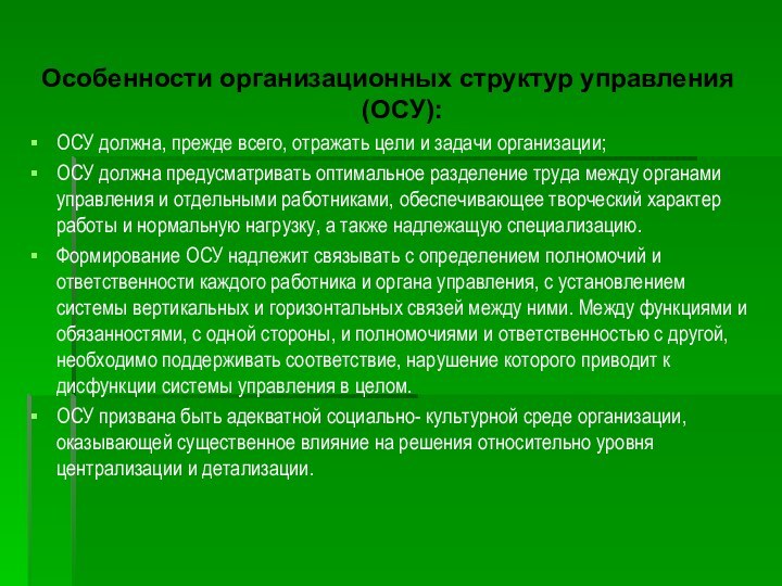 ОСУ призвана быть адекватной социально- культурной среде организации, оказывающей существенное влияние на решения относительно уровня централизации и детализации.