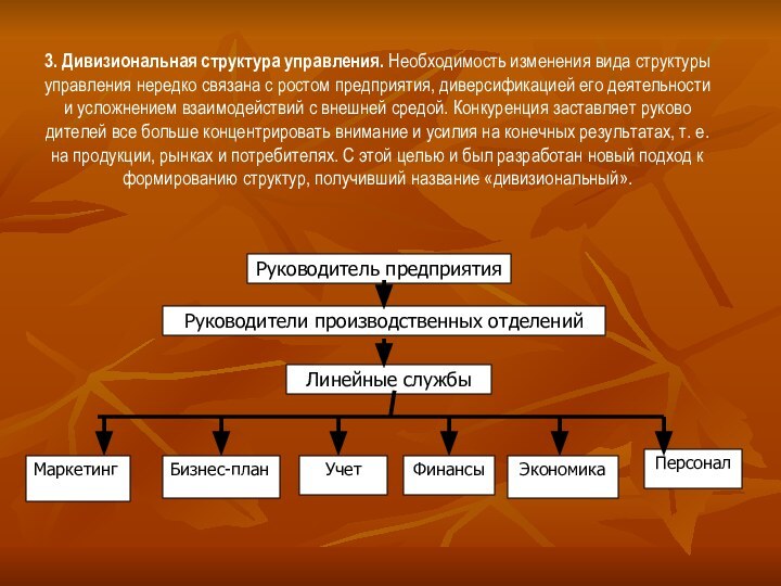 предприятия, диверсификацией его деятельности и усложнением взаимодействий с внешней средой. Конкуренция заставляет руководителей все больше концентрировать внимание и усилия на конечных результатах, т. е. на продукции, рынках и потребителях. С этой целью и был разработан новый подход к формированию структур, получивший название «дивизиональный».