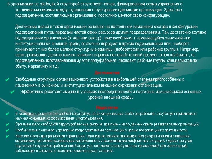 В настоящее время теория свободных структур организации весьма слабо разработана, отсутствует приемлемая научная концепция их формирования и использования.