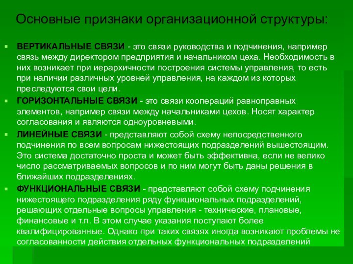 Отношения между элементами структуры управления поддерживаются благодаря связям, которые принято подразделять на горизонтальные и вертикальные.