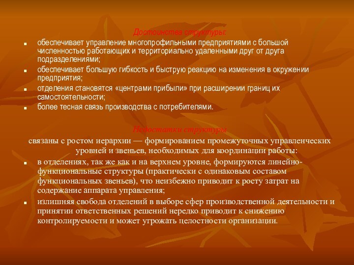 излишняя свобода отделений в выборе сфер производственной деятельности и принятии ответственных решений нередко приводит к снижению контролируемости и может угрожать целостности организации.