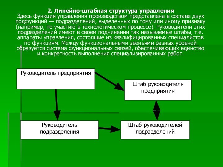 подфункций — подразделений, выделенных по тому или иному признаку (например, по участию в технологическом процессе). Руководители этих подразделений имеют в своем подчинении так называемые штабы, т.е. аппараты управления, состоящие из квалифицированных специалистов по функциям. Между функциональными звеньями разных уровней образуется система функциональных связей, обеспечивающих единство и конкретность выполнения специализированных работ.