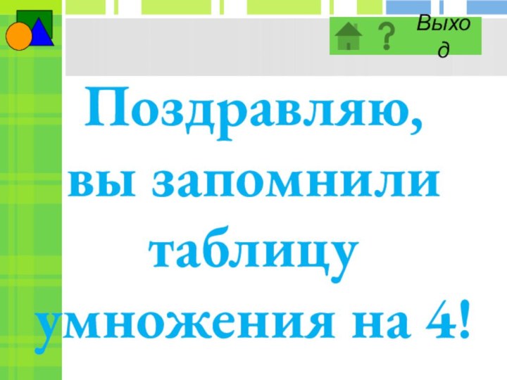 Изучение таблицы умножения Какую таблицу вы хотели бы выучить?23456789 Обидно,        но вы ошиблись! 2·124681012141618202 2·510468212141618202 2·364281012141618202 2·242681012141618202 2·714468101221618202 2·612468102141618202 2·918468101214162202 2·484621012141618202 2·1020468101214161822 2·816468101214218202 Поздравляю,      вы запомнили таблицу умножения на 2! 3·1369121518212427303 3·3936121518212427303 3·5156912318212427303 3·2693121518212427303 3·7216912151832427303 3·6186912153212427303 3·9276912151821243303 3·4126931518212427303 3·10306912151821242733 3·8246912151821327303 Поздравляю,      вы запомнили таблицу умножения на 3! 4·14812162024283236404 4·31248162024283236404 4·52081216424283236404 4·28124162024283236404 4·72881216202443236404 4·62481216204283236404 4·93681216202428324404 4·41681242024283236404 4·83281216202428436404 4·104081216202428323644 Поздравляю,      вы запомнили таблицу умножения на 4! 5·315510202530354045505 5·525101520530354045505 5·151015202530354045505 5·735101520253054045505 5·210155202530354045505 5·630101520255354045505 5·945101520253035405505 5·420101552530354045505 5·840101520253035545505 5·1050101520253035404555 Поздравляю,      вы запомнили таблицу умножения на 5! 6·636121824306424854606 6·161218243036424854606 6·318612243036424854606 6·530121824636424854606 6·212186243036424854606 6·742121824303664854606 6·954121824303642486606 6·424121863036424854606 6·848121824303642654606 6·1060121824303642485466 Поздравляю,      вы запомнили таблицу умножения на 6! 7·642142128357495663707 7·171421283542495663707 7·321714283542495663707 7·535142128742495663707 7·214217283542495663707 7·749142128354275663707 7·963142128354249567707 7·428142173542495663707 7·856142128354249763707 7·1070142128354249566377 Поздравляю,      вы запомнили таблицу умножения на 7! 8·648162432408566472808 8·181624324048566472808 8·324816324048566472808 8·540162432848566472808 8·216248324048566472808 8·756162432404886472808 8·972162432404856648808 8·432162484048566472808 8·864162432404856872808 8·1080162432404856647288 Поздравляю,      вы запомнили таблицу умножения на 8! 9·654182736459637281909 9·191827364554637281909 9·327918364554637281909 9·545182736954637281909 9·218279364554637254909 9·763182736455497281909 9·981182736455463729909 9·436182794554637281909 9·872182736455463981909 9·1090122736455463728199 Поздравляю,      вы запомнили таблицу умножения на 9! Тренажёр подготовила выполнила:Гугнина Юлия Станиславовна,учитель начальных классовМБОУ СОШ № 64Г. НовосибирскаE-mail: yuliyagugnina@yandex.ru
