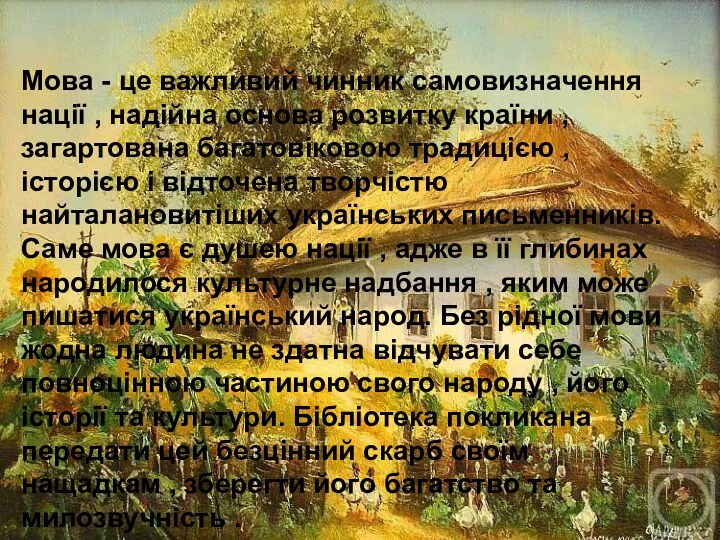 історією і відточена творчістю найталановитіших українських письменників. Саме мова є душею нації , адже в її глибинах народилося культурне надбання , яким може пишатися український народ. Без рідної мови жодна людина не здатна відчувати себе повноцінною частиною свого народу , його історії та культури. Бібліотека покликана передати цей безцінний скарб своїм нащадкам , зберегти його багатство та милозвучність .