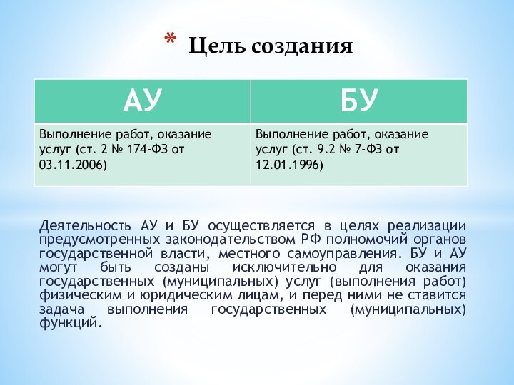 БУ и АУ могут быть созданы исключительно для оказания государственных (муниципальных) услуг (выполнения работ) физическим и юридическим лицам, и перед ними не ставится задача выполнения государственных (муниципальных) функций.