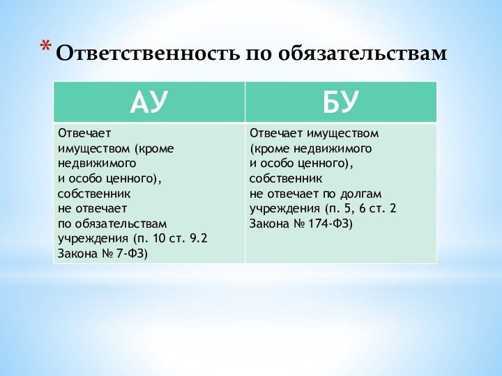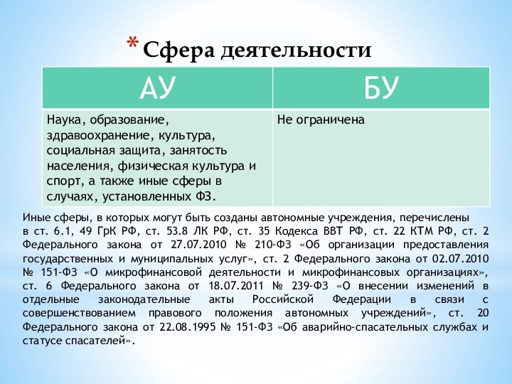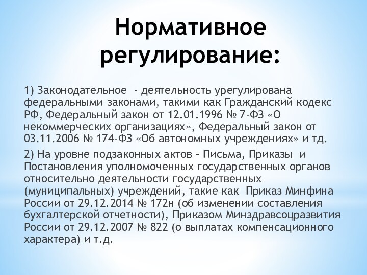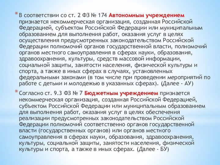 № 7-ФЗ «О некоммерческих организациях», Федеральный закон от 03.11.2006 № 174-ФЗ «Об автономных учреждениях» и тд.
