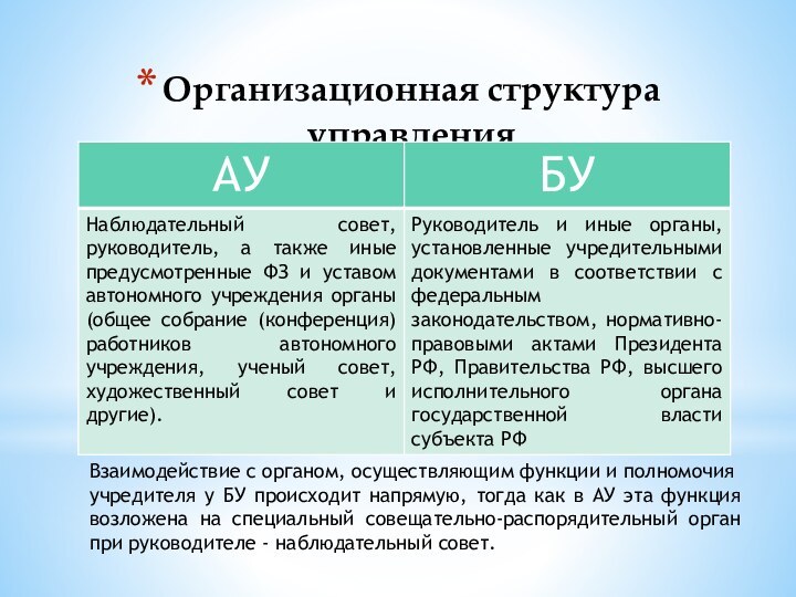 Для АУ взаимодействие с учредителем напрямую осуществляется в порядке уведомления, так как согласие учредителя не является ключевым условием ведения хозяйственной деятельности ввиду наличия в самом АУ наделенного аналогичными полномочиями органа управления.