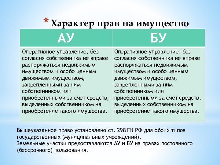 участки предоставляются АУ и БУ на правах постоянного