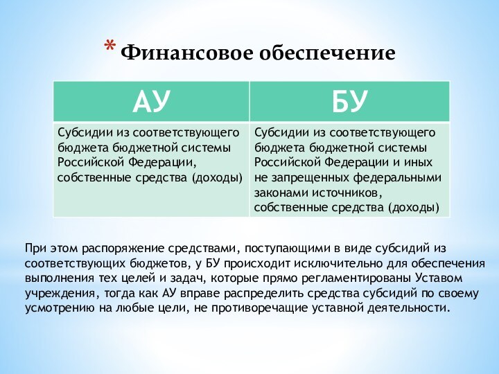 учреждения, тогда как АУ вправе распределить средства субсидий по своему