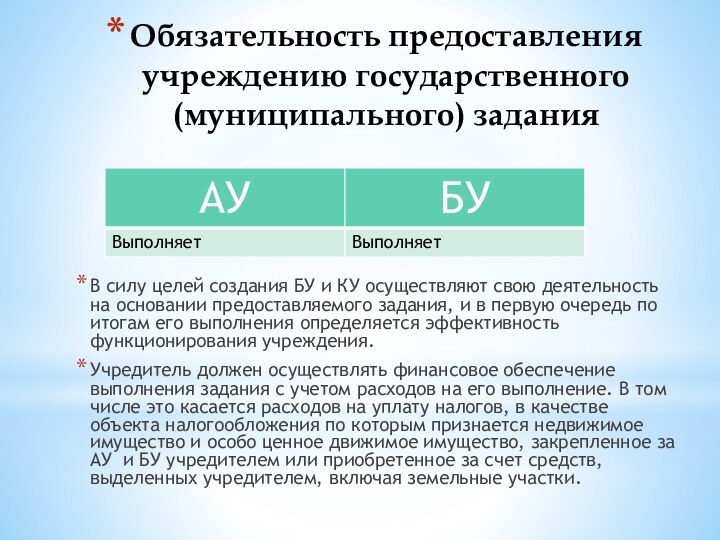 Учредитель должен осуществлять финансовое обеспечение выполнения задания с учетом расходов на его выполнение. В том числе это касается расходов на уплату налогов, в качестве объекта налогообложения по которым признается недвижимое имущество и особо ценное движимое имущество, закрепленное за АУ и БУ учредителем или приобретенное за счет средств, выделенных учредителем, включая земельные участки.